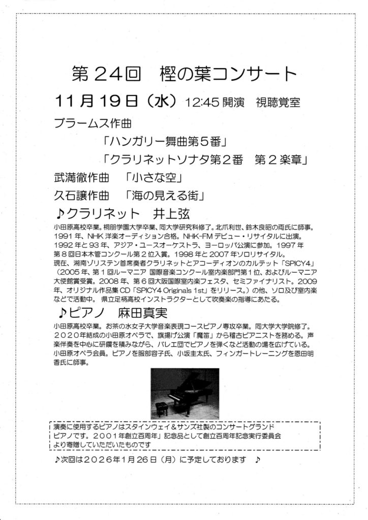 「樫の葉コンサート」は⺟校の昼休みに視聴覚室で年に数回⾏われるミニコンサートです。