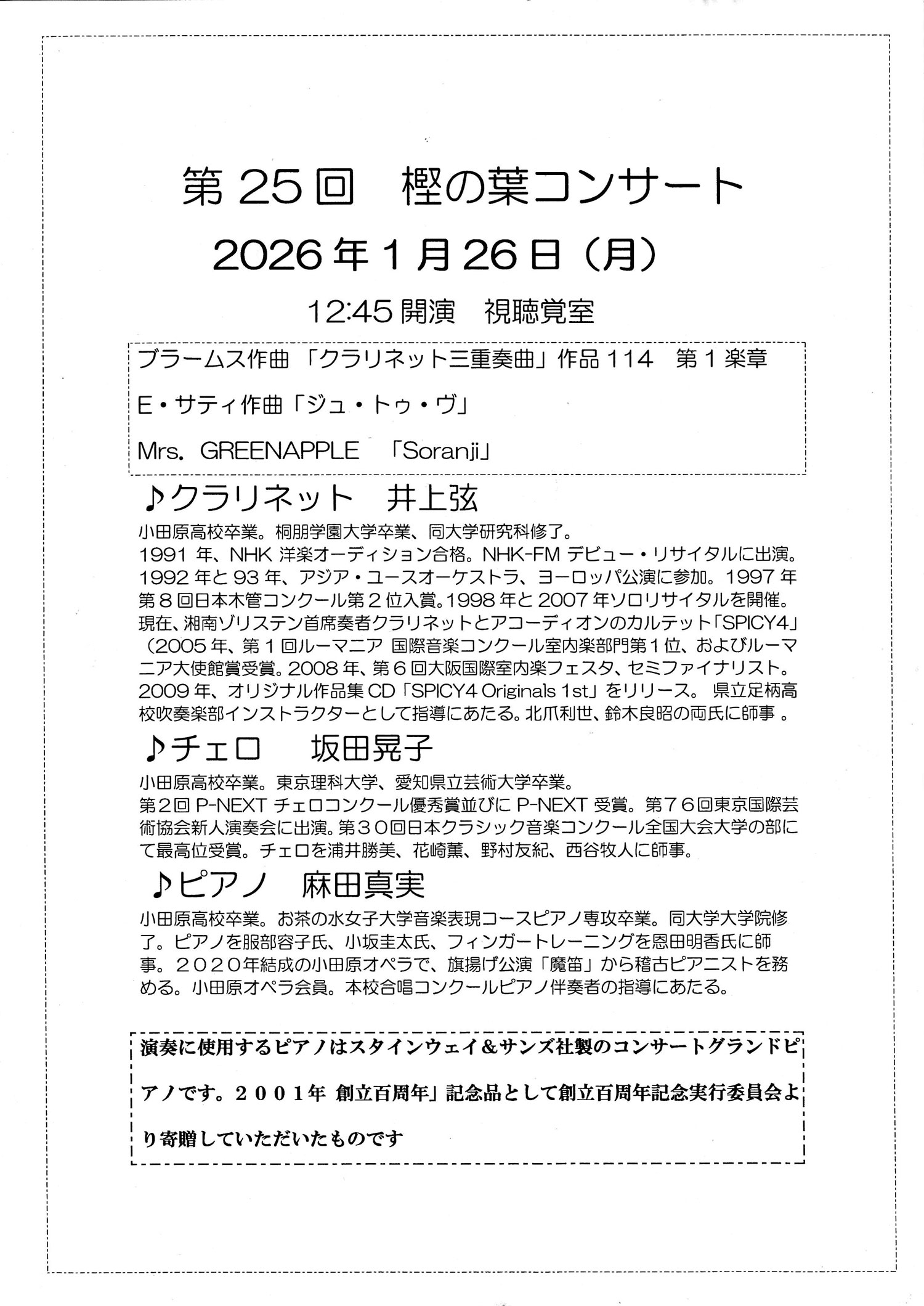 今般、本年度最後の樫の葉コンサートに同窓⽣及びその関係者も参加できる機会をいただきましたので次の通りご案内します。